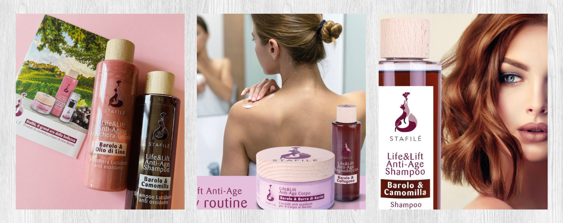 Le formulazioni Stafilé sono un concentrato puro di vino Barolo ar-ricchito di altri potenti principi attivi anti-age. Una fusione eccellente da cui “germoglia” la linea Stafilé Li-fe&Lift, ideata per pelli mature ed esigenti capace di proteggere la barriera epidermica idratando in profondità.